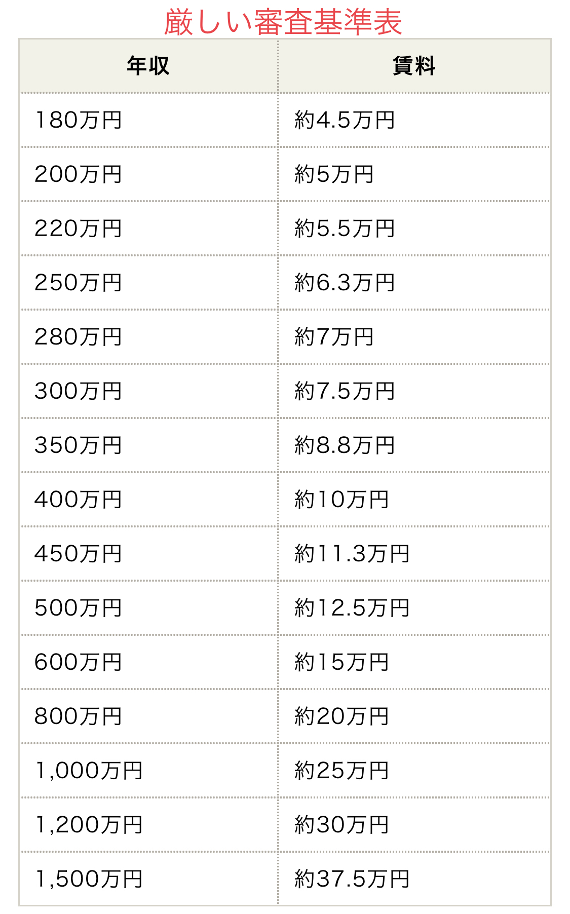 一般的な審査基準は、契約者の月収の1/3が家賃を上回るかどうかです。